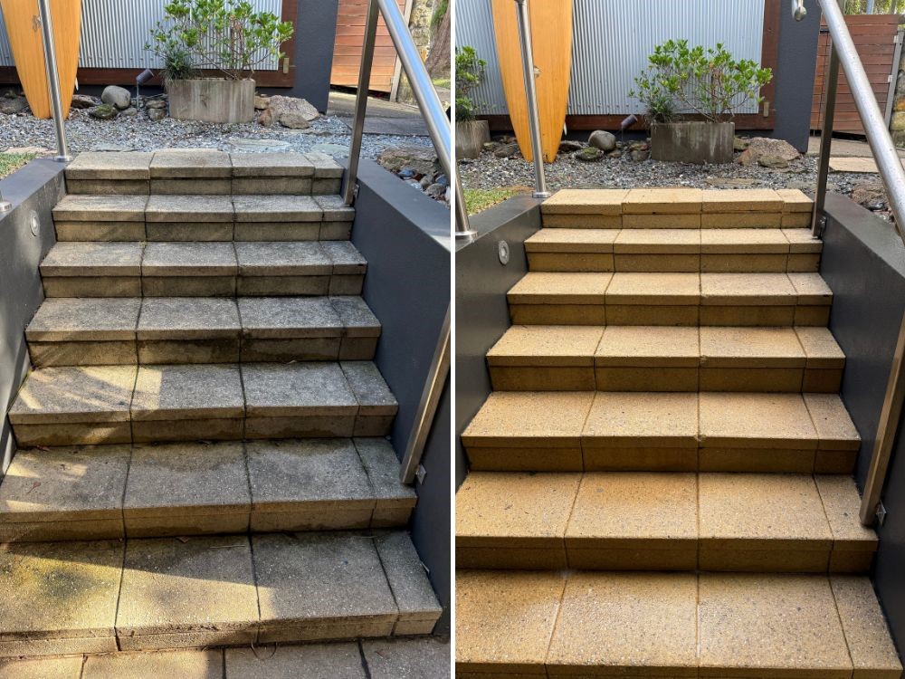 (Slippery when wet due to the thin layer of bacterial growth on top of pavers. Well, not anymore.)